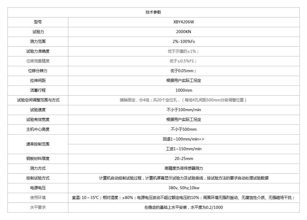 該試驗機采用機架整體鋼板焊接框架結(jié)構(gòu),單出桿雙作用活塞缸通過移動橫梁拉桿及前拉頭組成的反向架施加試驗力,通過銷軸方式聯(lián)接試樣,高精度負荷傳感器測力,根據(jù)試樣規(guī)格長度可有級調(diào)整后拉頭拉伸空間,后拉頭采用電動減速調(diào)整,手動竄銷固定于兩側(cè)框架,為計算機屏幕顯示試驗力及試驗曲線,按試驗方法的要求自動處理試驗數(shù)據(jù),本機主要適用于電力附具、電線電纜、雙鉤、安全帶、鏈條、鏈條葫蘆、大型標準件件、鋼絲繩、鋼絞線等繩類材料的拉伸強度測試驗。